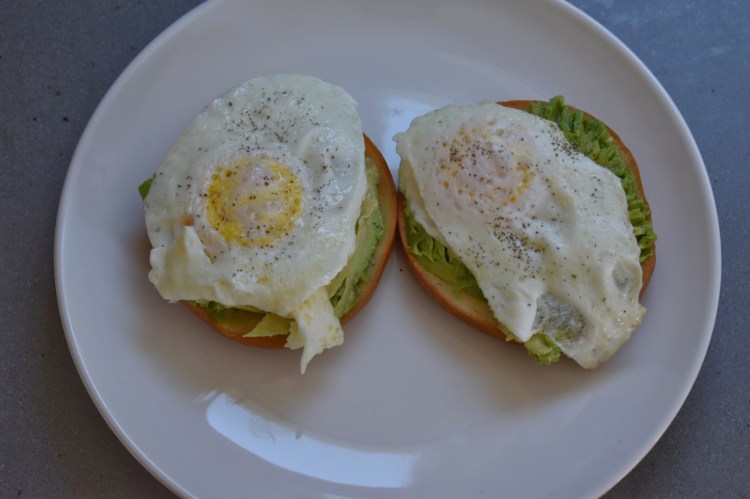 Thursday: For today I wanted something that was going to keep me full for a long time. I used a Trader Joes GF bagel, covered it with half an avocado (I like to kind of mush it onto the bagel) over-medium fried eggs and topped with smoked salt.