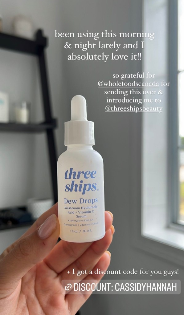 Three Ships Dew Drops – If you follow me on Instagram you would have seen me talk about these a few times now, but I absolutely love them. Whole Foods sent them over to me in a little skincare package and I have been so impressed by how clear and glowy my skin has looked since incorporating them into my routine. Since I started using them I’ve actually met the Three Ships team and it made me love them even more. This isn’t at all sponsored but they have shared a discount code with me for you guys, shop here with code CASSIDYHANNAH.