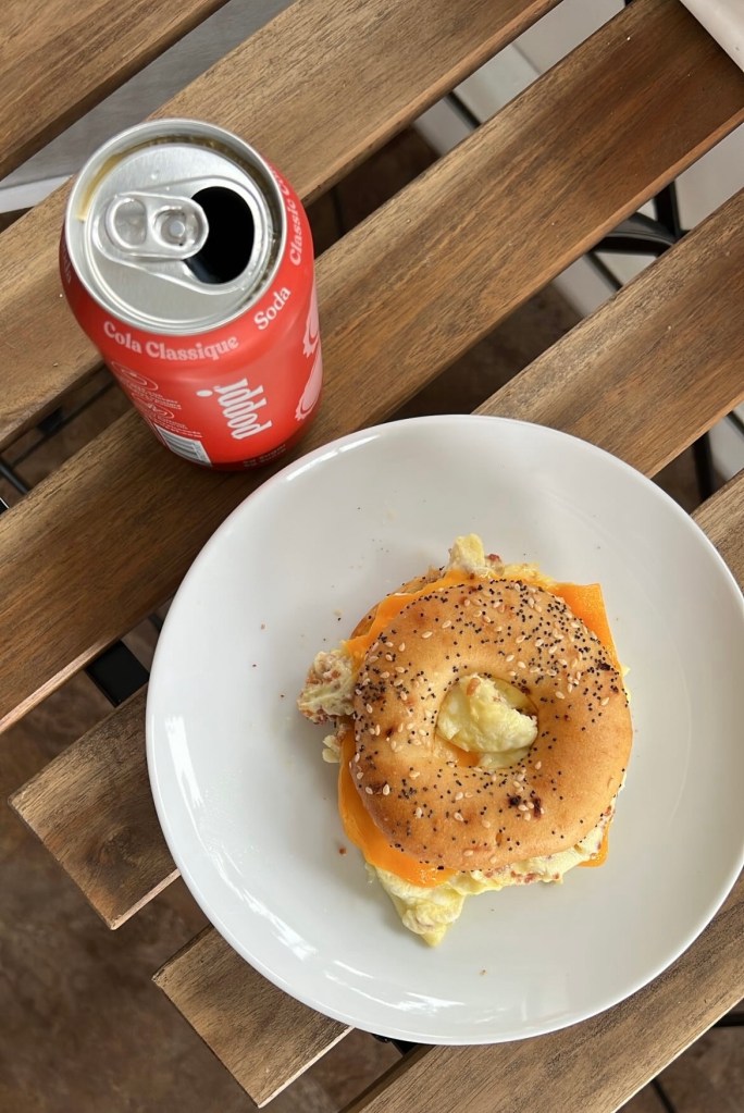 Breakfast Sandwich: scrambled egg, bacon bits & cheddar cheese on an O’Doughs bagel thin